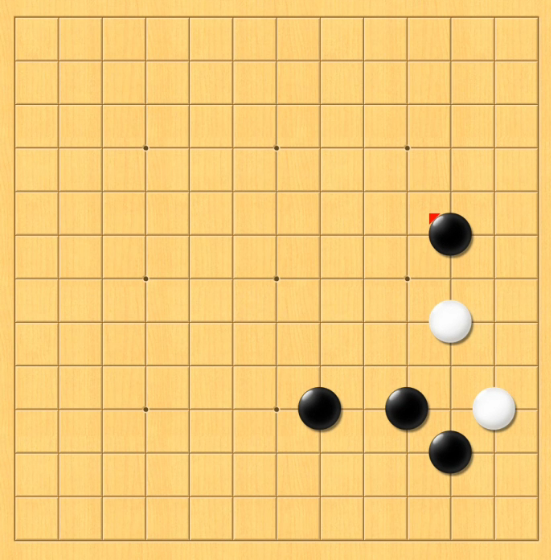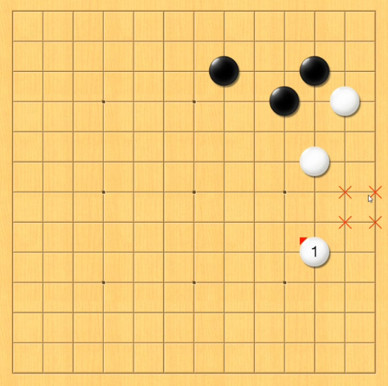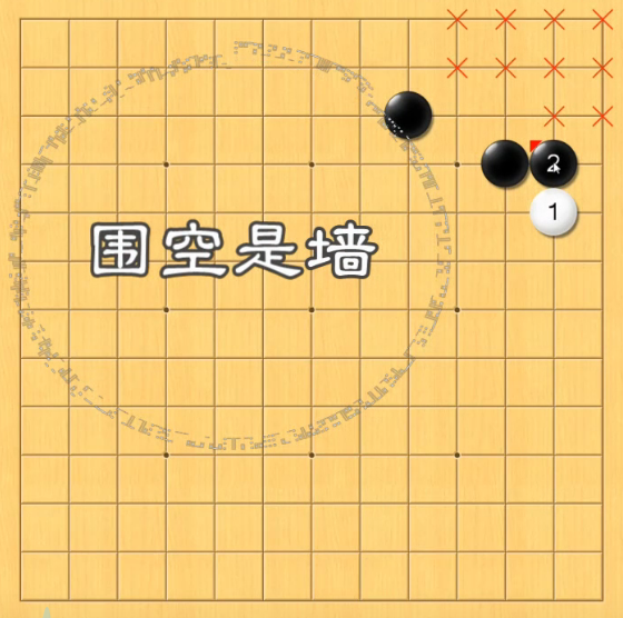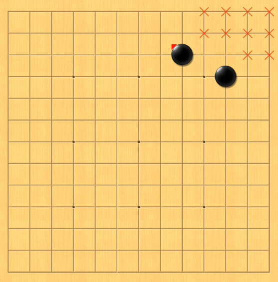 现在,这两颗黑子,因为有死亡线的帮忙,围住了角落X标记的地盘: