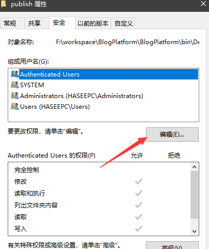 8.点击编辑权限,在安全选项卡里面选择编辑。