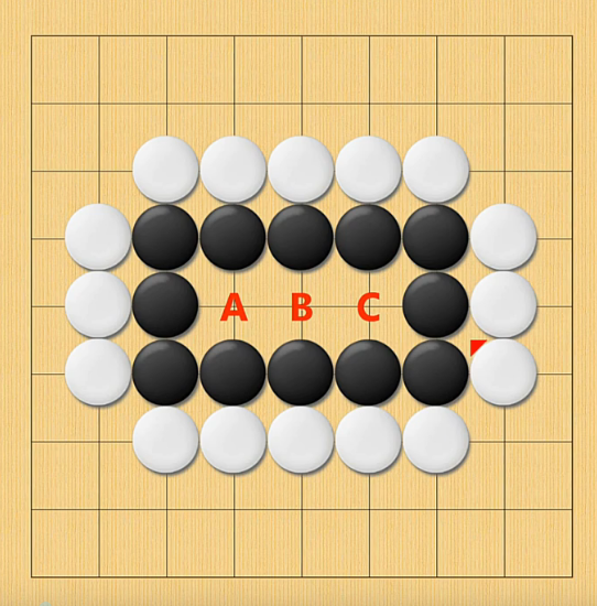 轮到黑棋了,这个时候黑棋只能下在B处。